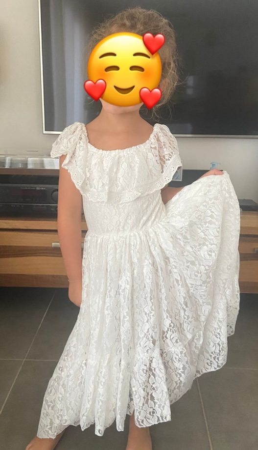 La robe va à merveille à ma petite! Légère traine… La robe tourne comme il faut! Merci!